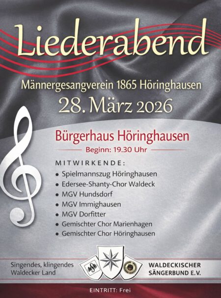 Bürgerhaus HöringhausenDer Männergesangverein 1865 Höringhausen lädt herzlich zum Liederabend ein! Am Samstag, 28. März 2026, erwartet die Besucherinnen und Besucher ein abwechslungsreicher Abend voller Chormusik im Bürgerhaus Höringhausen. Beginn ist um 19:30 Uhr.itwirkende Chöre und Musikgruppen aus der Region sorgen für ein vielseitiges musikalisches Programm:Spielmannszug Höringhausen • Edersee-Shanty-Chor Waldeck • MGV Hundsdorf • MGV Immighausen • […]
